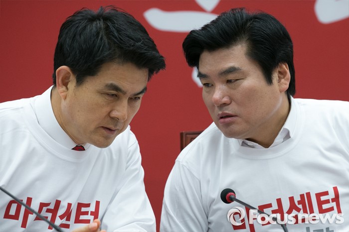 | △ 귀엣말하는 원유철·김태호 |
