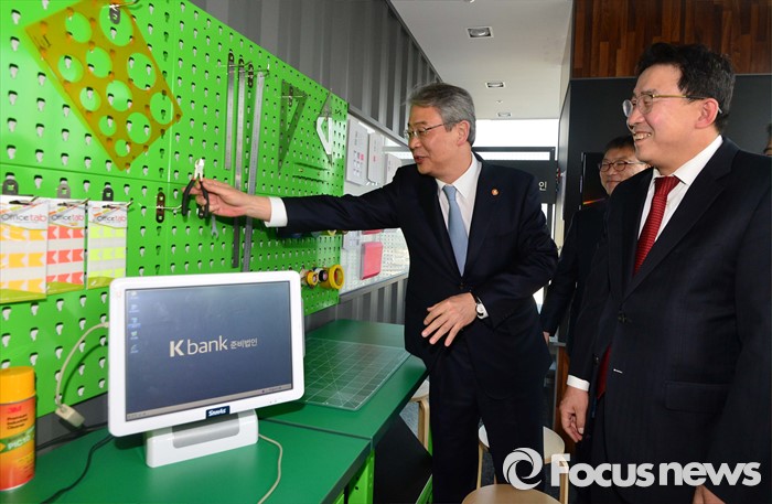 (서울=포커스뉴스) 임종룡(왼쪽) 금융위원장이 21일 오전 서울 종로구 더케이트윈타워에서 열린 ‘인터넷은행 현장간담회’에 참석해 아이디어룸을 살펴보고 있다.