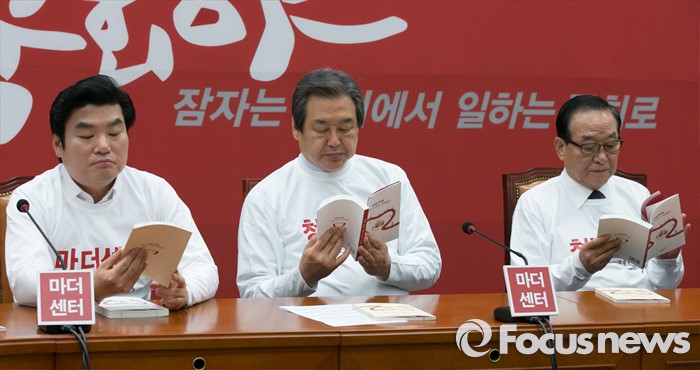 (서울=포커스뉴스) 김무성(가운데) 새누리당 대표와 원유철(왼쪽) 원내대표, 서청원 최고위원이 21일 오전 서울 여의도 국회에서 열린 최고위원회의에 참석해, 20대 총선 정책공약집을 보고있다.
