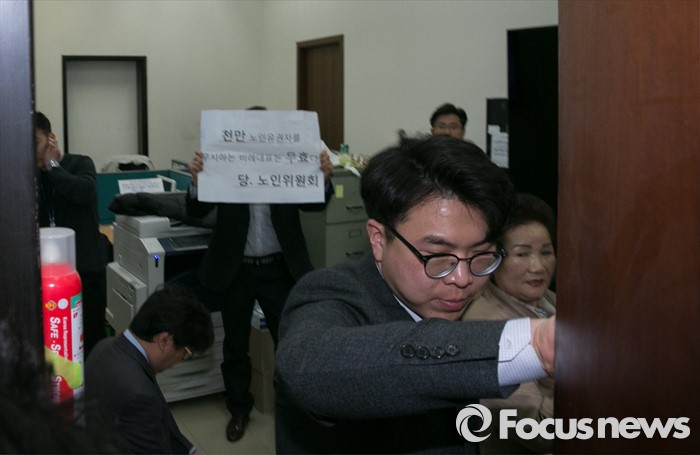 (서울=포커스뉴스) 21일 오전 서울 여의도 국회 더불어민주당 비대위 대표회의실에서 전국실버위원회 당원들이 비례대표 후보 공천 등에 항의하고 있다.