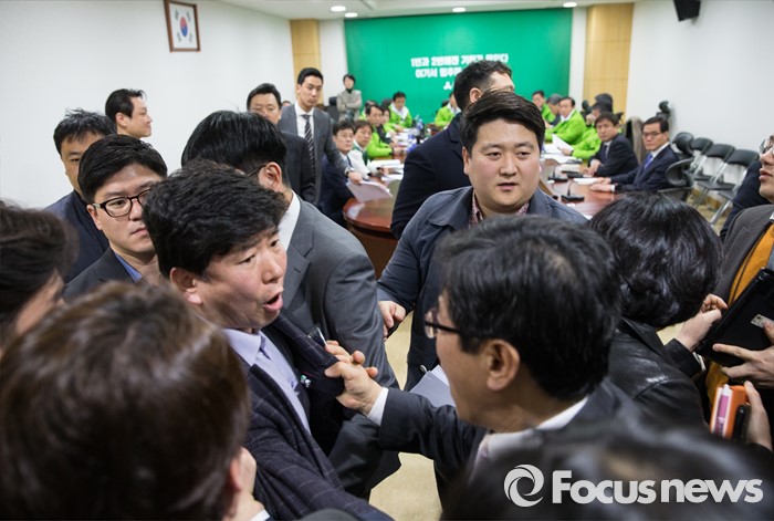(서울=포커스뉴스) 21일 오전 서울 여의도 국회 의원회관에서 열린 국민의당 최고위원회의 회의장 앞에서 당원들이 호남 지역구 공천 결과에 대해 항의하고 있다.