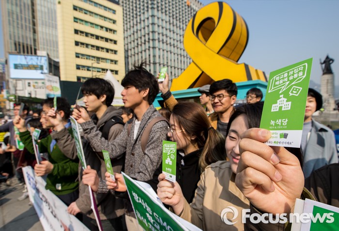 (서울=포커스뉴스) 21일 오전 서울 광화문 광장에서 열린 녹색당 교육(배움) 공약 발표 기자회견에 참석한 학생 및 당원들이 '학교를 뒤집자, 배움에 숨통을'이 적힌 소형 손팻말을 들고 있다.