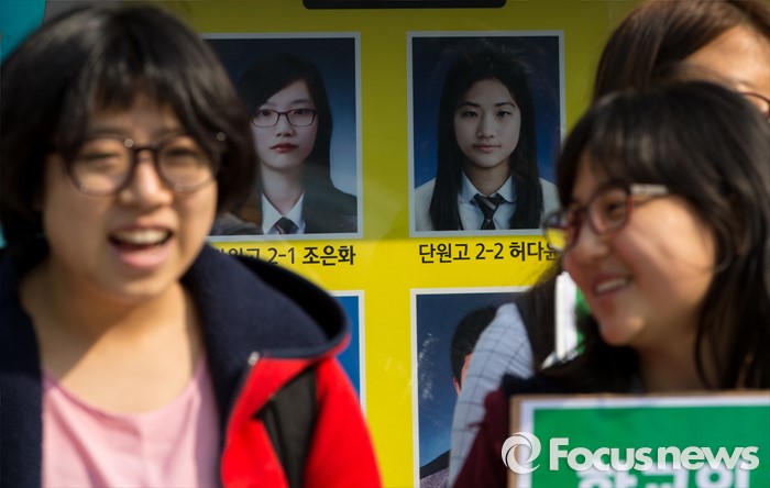 (서울=포커스뉴스) 21일 오전 서울 광화문 광장에서 열린 녹색당 교육(배움) 공약 발표 기자회견에 참석한 학생들 뒤로 세월호 희생자 학생의 사진이 걸려 있다.