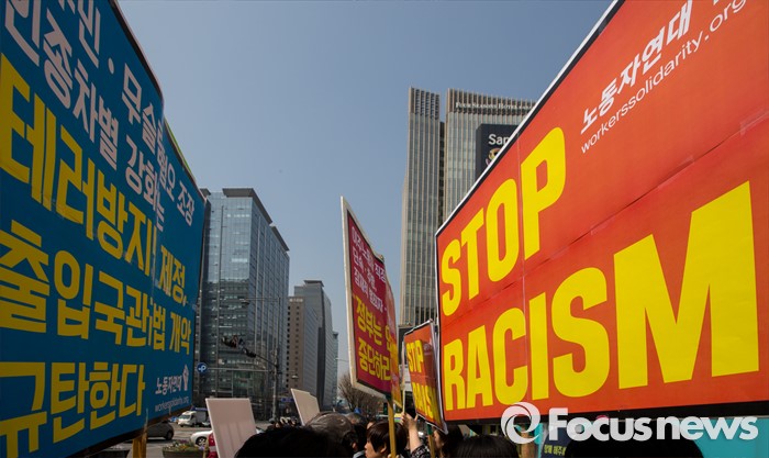 (서울=포커스뉴스) 21일 오전 서울 광화문 광장에서 열린 '세계인종차별철폐의 날 맞이 제 이주 인권 노동 사회단체 국제연대 공동 기자회견'에서 참석자들이 인종차별에 반대하는 손팻말을 들고 있다.