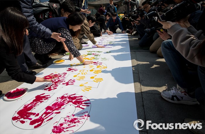 (서울=포커스뉴스) 21일 오전 서울 광화문 광장에서 열린 '세계인종차별철폐의 날 맞이 제 이주 인권 노동 사회단체 국제연대 공동 기자회견'에서 참석자들이 'STOP RACISM'(인종차별 금지)가 적힌 현수막에 손도장을 찍고 있다.