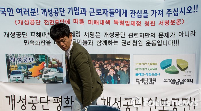 (서울=포커스뉴스) 21일 오전 서울 광화문 광장에서 개성공단 근로자 협의회 관계자들이 피해대책 특별법제정 청원 서명운동 본부를 설치하고 있다.
