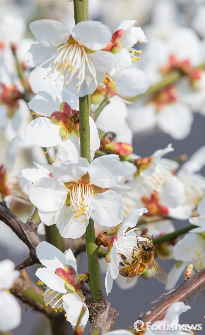 (서울=포커스뉴스) 봄 기운이 완연한 21일 오후 서울 종로구 탑골공원 인근의 매화 위에서 꿀벌이 꽃가루를 모으고 있다.