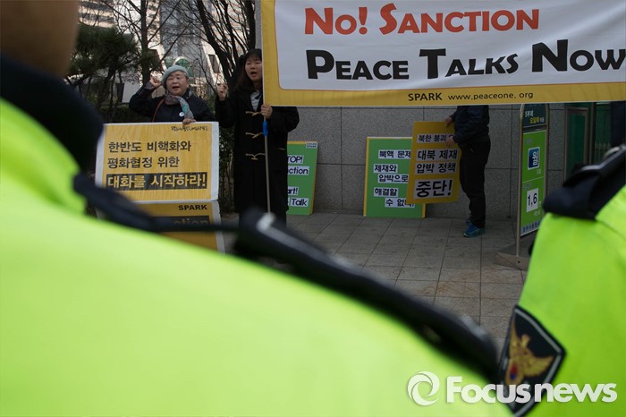 (서울=포커스뉴스) 21일 오후 정부서울청사 별관앞에서 '평화와 통일을 여는 사람들'(평통사) 회원들이 한미 양국의 강경 대북제재에 반대하며 집회를 열고 있다.
