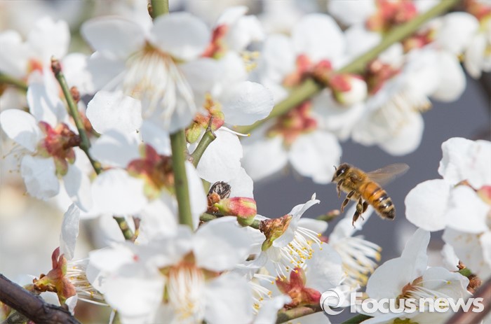 (서울=포커스뉴스) 봄 기운이 완연한 21일 오후 서울 종로구 탑골공원 인근의 매화 위에서 꿀벌이 꽃가루를 모으고 있다.