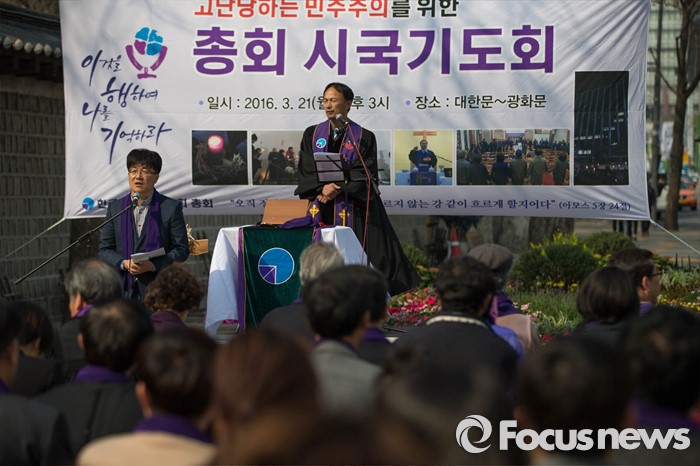 (서울=포커스뉴스) 21일 오후 서울 중구 덕수궁 대한문 앞에서 한국기독교 장로회 총회 '고난당하는 민주주의를 위한 시국기도회'가 열리고 있다.