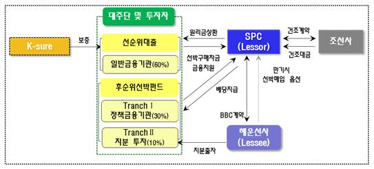 선순위투자는 일반금융기관에게 돌아가며 5개 정책금융기관 중 4개 기관은 후순위투자 중 30%의 재원을 지원한다. 산업은행 14.8%(1775만달러), 수출입은행 10%(1200만달러), 자산관리공사 4.2%(500만달러) 산은캐피탈 1.0%(125만달러) 다. 해운사 역시 공적자금을 투여받기 때문에 후순위투자 중 10%(1200만달러)를 부담해야 한다.