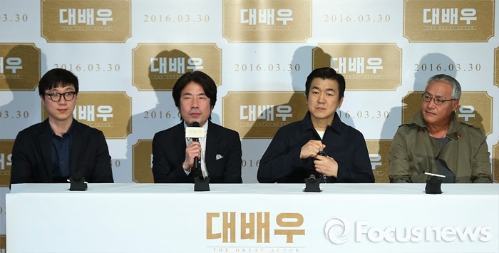 영화 '대배우'는 20년 차 무명배우 장성필(오달수 분)의 이야기를 담았다. 그는 파트라슈를 연기하던 무대를 떠나 유명감독 깐느박(이경영 분)이 연출하고, 충무로 대표배우 설강식(윤제문 분)이 주연을 맡은 영화 촬영에 도전한다. 이는 오는 3월 30일 개봉해 관객과 만난다.21일 오후 서울 광진구 건대입구 롯데시네마에서 열련 영화 '대배우' 언론시사회에 참석한 배우 오달수가 인사말을 하고 있다. 왼쪽부터 영화감독 석민우, 배우 오달수, 윤제문, 이경영. 2016.03.21 김유근 기자