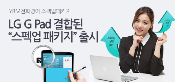 '스펙업 패키지'는 YBM전화영어의 프리미엄 전문회화 코스인 S.P.Y의 6개월·1년 수강권과 LG전자 'G Pad II 8.0'을 묶은 상품이다. 미국이나 필리핀 중 원하는 국가를 선택할 수 있고, 학습 기간과 강의 횟수에 따라 최대 40%의 할인 혜택이 적용된다.