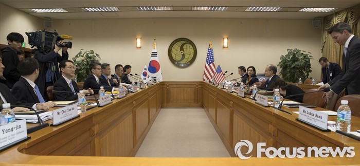 (서울=포커스뉴스) 대니얼 프리드 미 국무부 제재정책조정관(왼쪽)과 김홍균 한반도평화교섭본부장이 21일 오후 정부서울청사 별관 외교부 17층 양자회의실에서 열린 '한미 고위급 대북제재 협의'에 참석해 인사를 하고 있다.