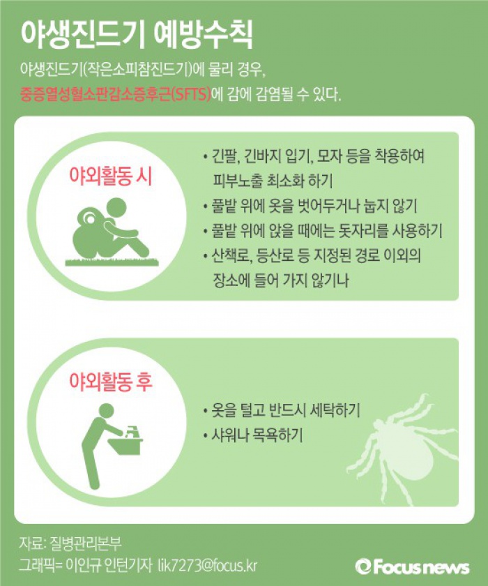 (서울=포커스뉴스) 21일 질병관리본부에 따르면 야생진드기는 4월부터 활동이 활발해 진다. 야생진드기에게 물릴 경우 중증열성혈소판감소증후군(SFTS)과 쯔쯔가무시증을 옮길 수 있기 때문에 주의가 필요하다.