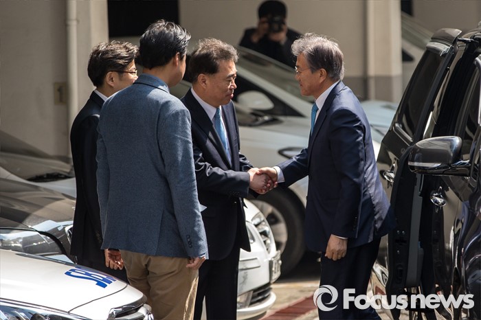 (서울=포커스뉴스) 문재인 전 더불어민주당 대표가 김종인 비상대책위 대표와 면담하기 위해 22일 오후 서울 종로구 김 대표 자택으로 이동하며 김성수 대변인과 악수하고 있다.