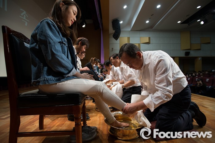 (서울=포커스뉴스) 22일 오후 서울 서대문구 명지대학교 세족식 행사에서 유병진 총장이 학생의 발을 씻겨 주고 있다.