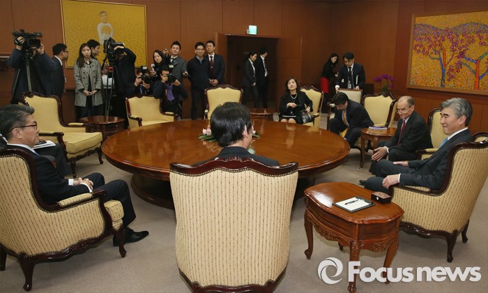 (서울=포커스뉴스)윤병세 외교부 장관이 22일 오후 서울 종로구 외교부 청사에서 성김 미 대북정책 특별대표, 대니얼 프리드 제재정책조정관, 마크 리퍼트 주한미국 대사를 접견하고 있다.