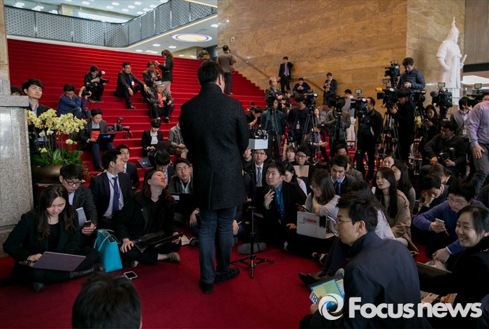(서울=포커스뉴스) 22일 오후 서울 여의도 국회에서 취재진이 비공개 회의에 참석한 김종인 더불어민주당 비대위 대표를 기다리고 있다.