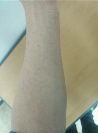 (서울=포커스뉴스)22일 질병관리본부가 공개한 지카바이러스 양성 판정을 받은 L(43)씨의 지난 21일 발진 사진. 질병관리본부는 현재 L씨는 발열이 없고 발진이 가라앉아 호전 중이라고 밝혔다. <사진제공=질병관리본부>