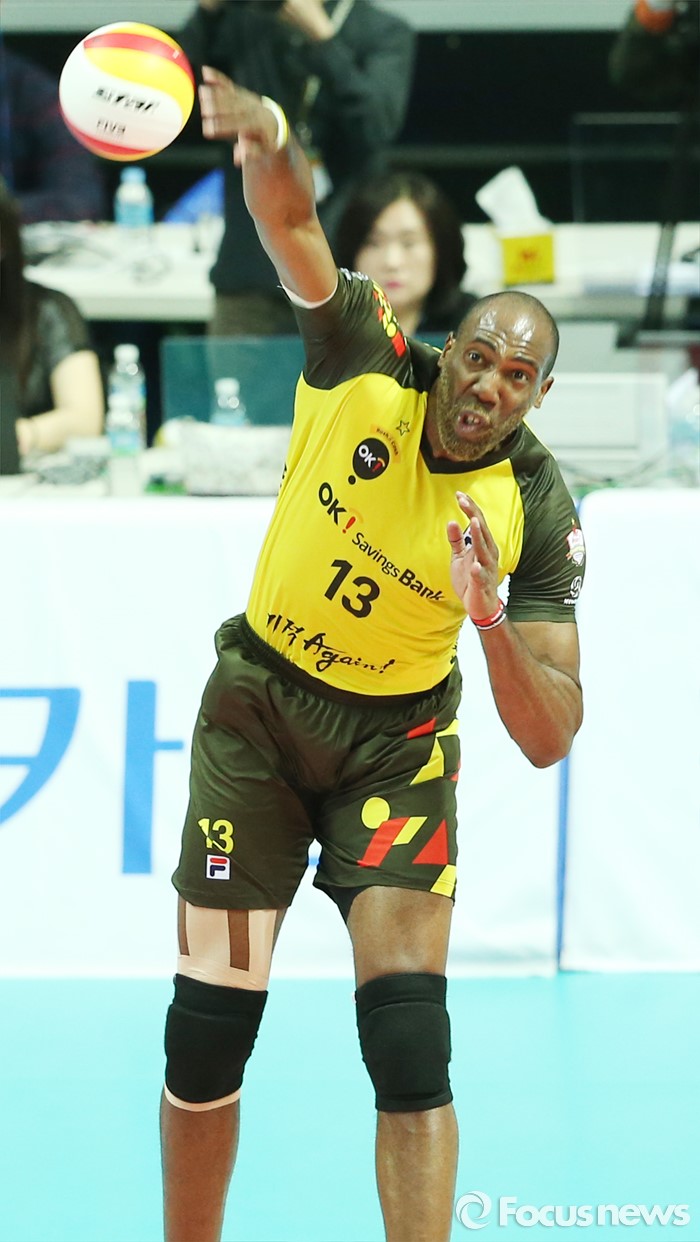(안산=포커스뉴스) 22일 안산상록수체육관에서 열린 2015-2016 V-리그 남자부 챔피언결정전 3차전 OK저축은행-현대캐피탈 경기에서 OK저축은행 시몬이 강력한 스파이크 서브를 넣고 있다.