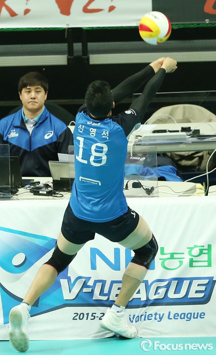 (안산=포커스뉴스) 22일 안산상록수체육관에서 열린 2015-2016 V-리그 남자부 챔피언결정전 3차전 OK저축은행-현대캐피탈 경기에서 현대캐피탈 신영석이 기록석까지 달려가 볼을 살리고 있다.