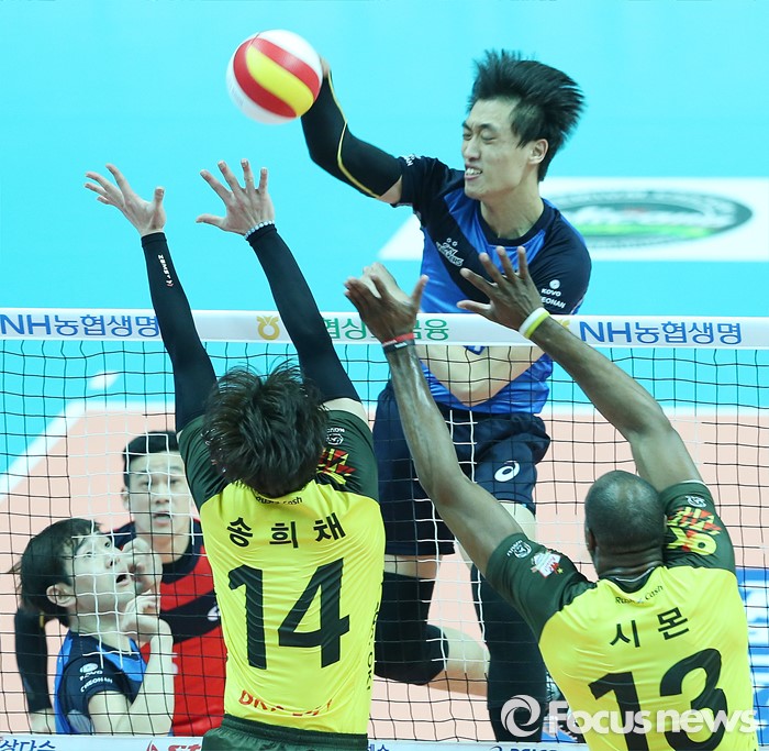 (안산=포커스뉴스) 22일 안산상록수체육관에서 열린 2015-2016 V-리그 남자부 챔피언결정전 3차전 OK저축은행-현대캐피탈 경기에서 현대캐피탈 진성태가 OK저축은행 송희채, 시몬의 블로킹을 피해 속공을 시도하고 있다.