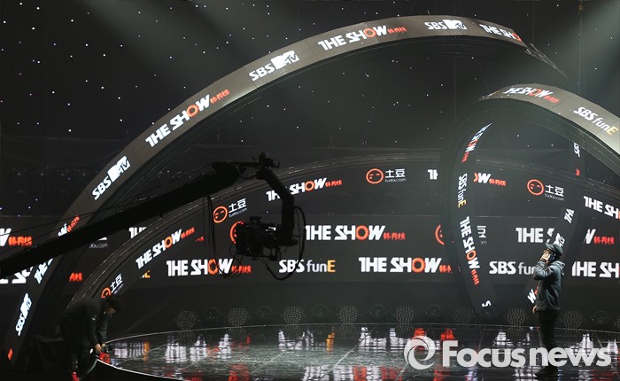 (서울=포커스뉴스) 22일 오후 서울 마포구 SBS프리즘 타워에서 열린 2016 '더쇼' 생방송 현장에 한 스태프가 조명상태를 확인하고 있다.