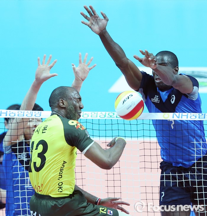 (안산=포커스뉴스) 22일 안산상록수체육관에서 열린 2015-2016 V-리그 남자부 챔피언결정전 3차전 OK저축은행-현대캐피탈 경기에서 현대캐피탈 오레올이 OK저축은행 시몬의 공격을 블로킹으로 막아 넘기고 있다.
