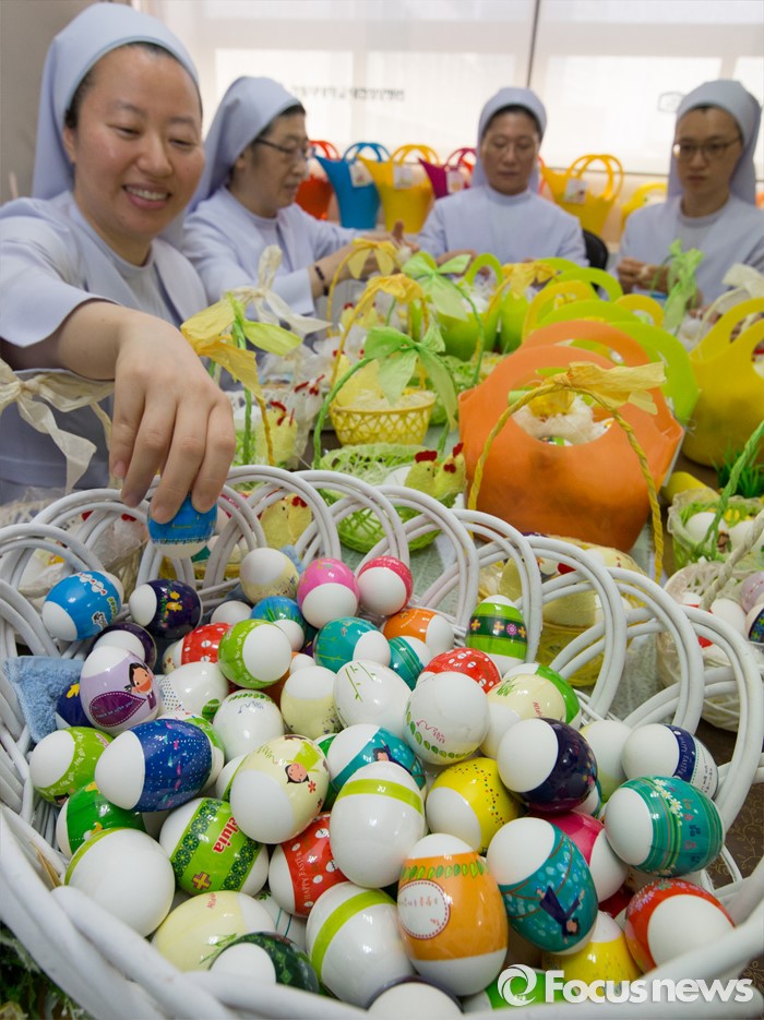 (대전=포커스뉴스) 부활절을 앞두고 23일 오전 대전 중구 가톨릭대학교 대전성모병원 원목팀 수녀들이 정성스럽게 꾸민 달걀을 바구니에 담고 있다. 이날 가톨릭대학교 대전성모병원 직원들은 생명의 탄생을 의미하는 부활 달걀 총 3000여개를 병동의 환자 및 보호자, 지역주민들에게 전달했다.