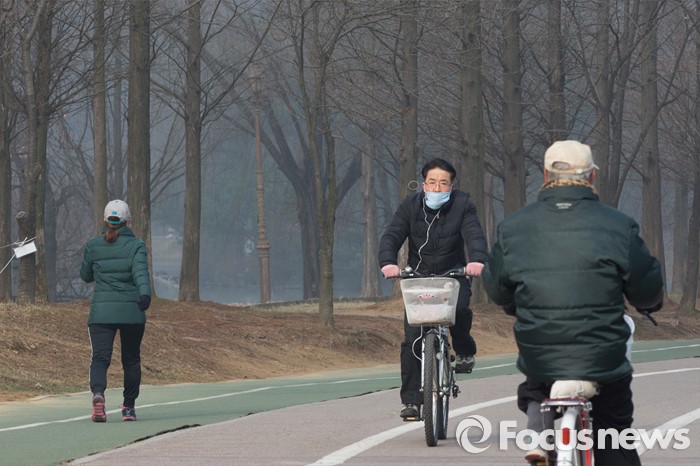 (고양=포커스뉴스) 꽃샘추위가 다시 시작된 23일 오전 경기도 고양시 일산 호수공원에서 시민들이 운동을 하고 있다. 미세먼지는 수도권에서 아침 한때 '나쁨'이 되겠지만 곧 '보통' 수준으로 회복될 것을 예상한다.
