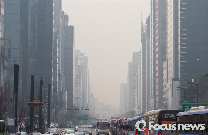 (서울=포커스뉴스) 23일 오전 서울 강남대로가 미세먼지로 뿌연 모습을 보이고 있다. 기상청은 미세먼지 농도가 수도권에서 아침 한때 '나쁨'이 되겠지만 곧 '보통' 수준으로 회복될 것을 예상했다.