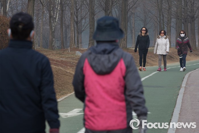 (고양=포커스뉴스) 꽃샘추위가 다시 시작된 23일 오전 경기도 고양시 일산 호수공원에서 시민들이 운동을 하고 있다. 미세먼지는 수도권에서 아침 한때 '나쁨'이 되겠지만 곧 '보통' 수준으로 회복될 것을 예상한다.