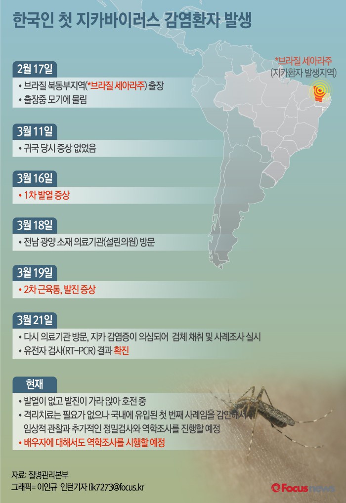 (서울=포커스뉴스) 질병관리본부(본부장 정기석)는 국내에서 지카바이러스 감염증 의심환자에 대해 유전자 검사를 실시한 결과 3월22일에 확진됐다고 밝혔다.