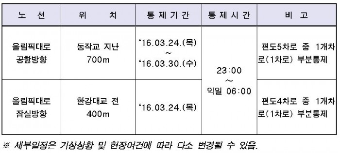 서울시설공단은 올림픽대로 노량교 구간 중분대 방호벽 표면 보수공사를 시행함에 따라 교통통제를 실시한다고 23일 밝혔다.