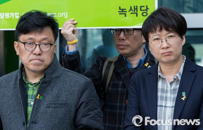 (서울=포커스뉴스) 23일 오후 서울행정법원 앞에서 열린 '청와대 상대 정보공개 소송 결과' 관련 기자회견에 참석한 하승수(왼쪽), 이유진 녹색당 공동운영위원장이 굳은 표정을 짓고 있다.