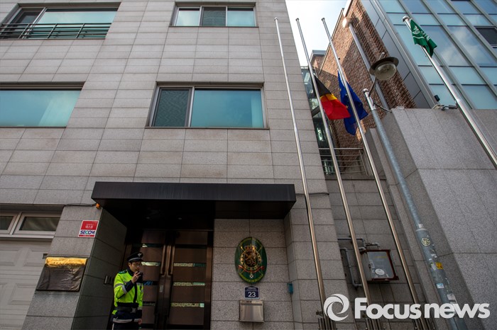 (서울=포커스뉴스) 23일 오전 서울 용산구 주한벨기에 대사관 앞에 지난 22일 벨기에 브뤼셀에서 발생한 동시 다발 테러 희생자들을 추모하는 조기가 게양돼있다.