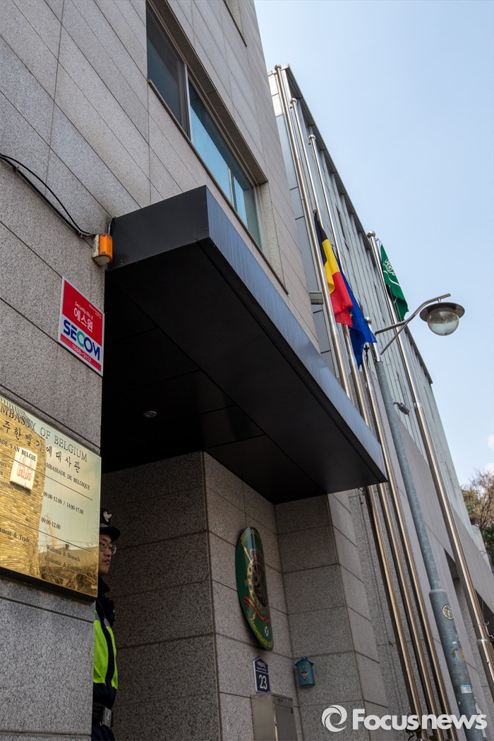 (서울=포커스뉴스) 23일 오전 서울 용산구 주한벨기에 대사관 앞에 지난 22일 벨기에 브뤼셀에서 발생한 동시 다발 테러 희생자들을 추모하는 조기가 게양돼있다.