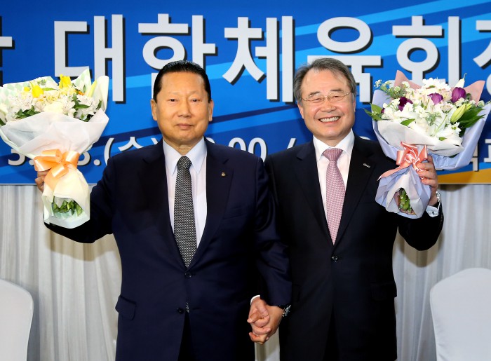 일단 통합 대한체육회장은 김정행 회장과 강영중 회장의 공동 회장 체재로 운영된다. 올 10월 새 회장을 선출한다.대한체육회 김정행(왼쪽) 강영중 공동회장이 23일 서울 송파구 올림픽파크텔에서 열린 취임식에서 사진촬영을 하고 있다. <사진제공=대한체육회>