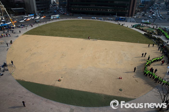 (서울=포커스뉴스) 서울시가 겨울 동안 스케이트장으로 사용됐던 서울광장에 23일 오후 잔디를 새롭게 단장하고 있다.
