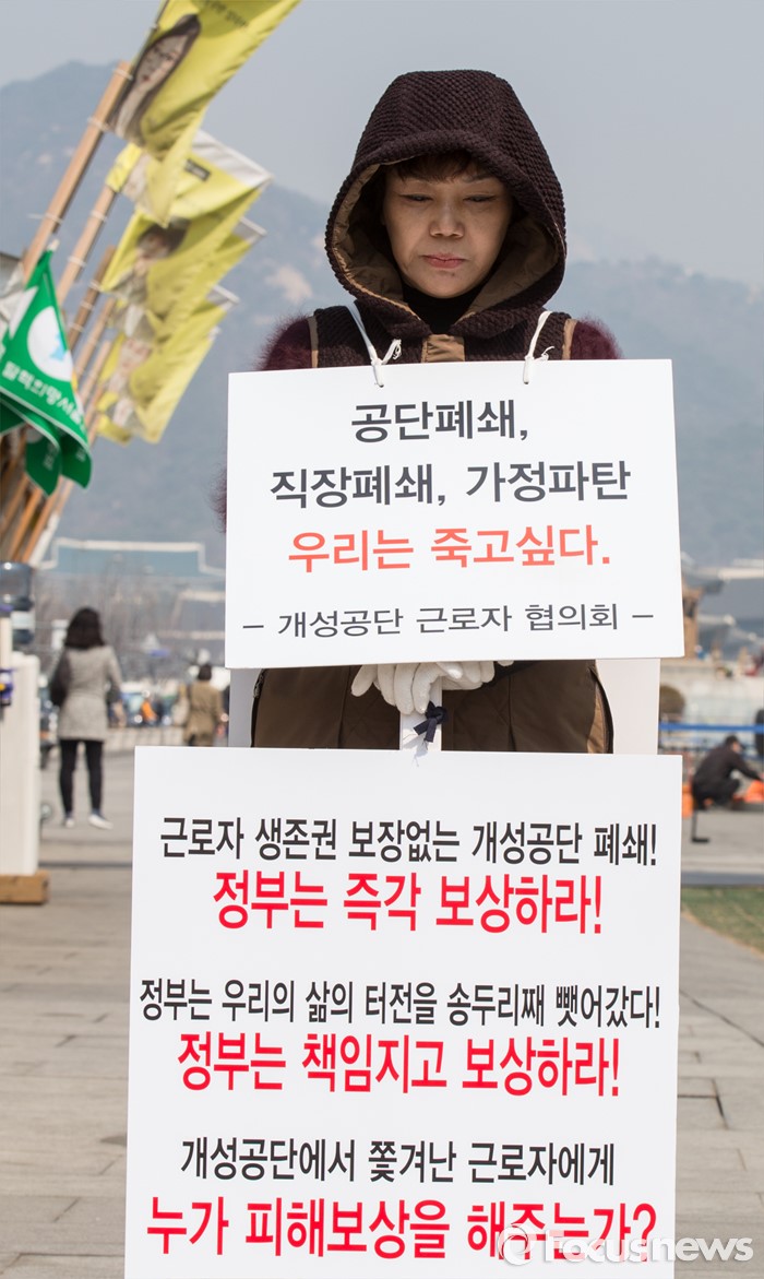아울러 "북한이 제재국면의 전환을 노리고 6자회담 복귀, 비핵화·평화협정 병행 논의 등 협상모드로 나올 경우에 대비해야 한다"며 "시나리오별 당사국들과의 교섭과 협력을 위한 전략적 로드맵을 강구해야 한다"고 주장했다.(서울=포커스뉴스) 21일 오전 서울 광화문 광장에서 개성공단 근로자 협의회의 한 관계자가 개성공단 폐쇄에 따른 정부의 보상을 촉구하는 팻말을 몸에 두르고 있다. 2016.03.21 양지웅 기자