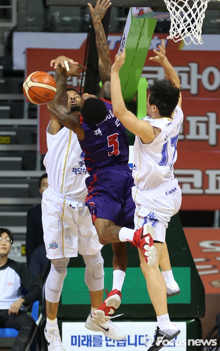 (고양=포커스뉴스) 23일 고양체육관에서 열린 2015-2016 프로농구 챔피언결정전 3차전 오리온-KCC경기에서 오리온 조 잭슨의 골밑 레이업슛을 KCC 에밋이 슛블록으로 쳐내고 있다.