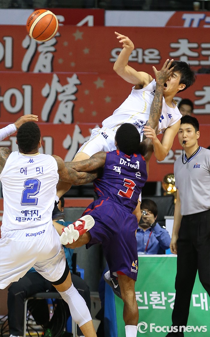 (고양=포커스뉴스) 23일 고양체육관에서 열린 2015-2016 프로농구 챔피언결정전 3차전 오리온-KCC경기에서 오리온 조 잭슨이 KCC 신명호의 슈팅을 저지하다 얼굴을 치고 있다.