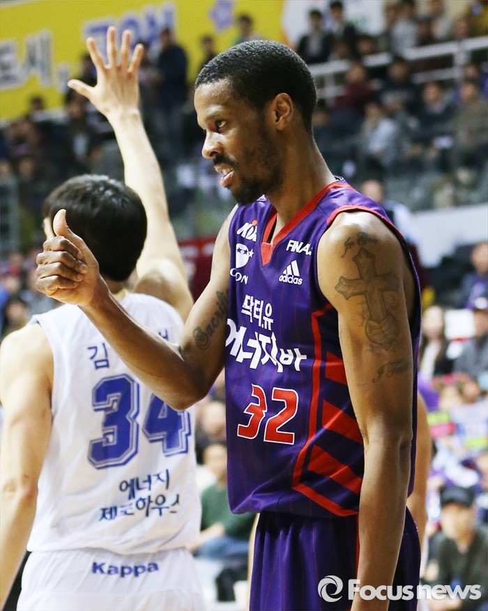 (고양=포커스뉴스) 23일 고양체육관에서 열린 2015-2016 프로농구 챔피언결정전 3차전 오리온-KCC경기에서 오리온 헤인즈가 문태종을 향해 엄지 손가락을 들어 보이고 있다.