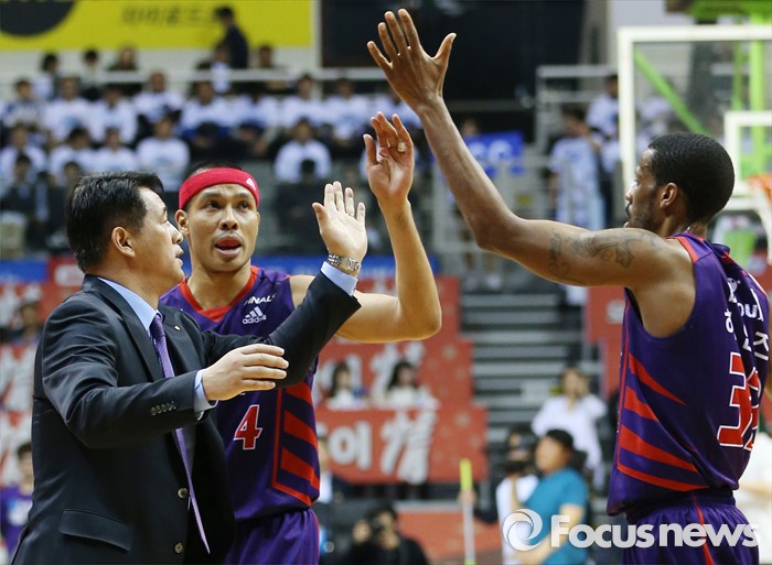 (고양=포커스뉴스) 23일 고양체육관에서 열린 2015-2016 프로농구 챔피언결정전 3차전 오리온-KCC경기에서 오리온 추일승 감독이 3점슛을 성공시킨 문태종, 헤인즈와 손바닥을 마주치고 있다.