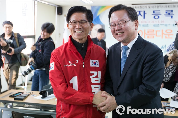 (대구=포커스뉴스) 24일 오전 대구 수성구 선거관리위원회에서 김문수(왼쪽) 새누리당 전 의원과 김부겸 더불어민주당 전 의원이 20대 총선 국회의원 후보 등록 후 기념촬영을 하고 있다.