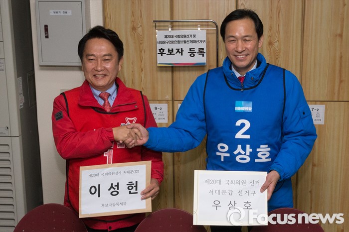 (서울=포커스뉴스) 24일 오전 서울 서대문구 선거관리위원회에서 우상호(오른쪽) 더불러민주당 전 의원과 이성헌 새누리당 전 의원이 20대 총선 국회의원 후보 등록 후 기념촬영하고 있다.