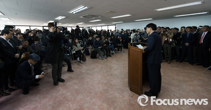 (인천=포커스뉴스) 새누리당을 탈당한 윤상현 의원이 24일 오전 인천 남구 지역구 사무실에서 무소속 출마 선언 기자회견을 하고 있다.