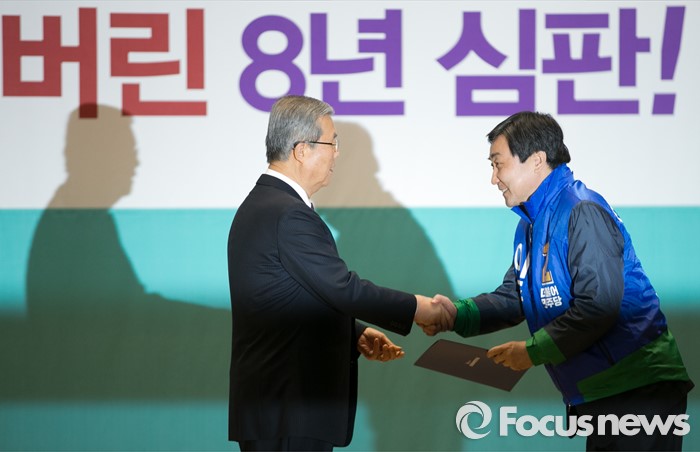 (서울=포커스뉴스) 김종인(왼쪽) 더불어민주당 비대위 대표가 24일 오전 서울 여의도 국회에서 공천장 수여식에 참석해 이종걸 원내대표에게 공천장을 전달하고 있다.