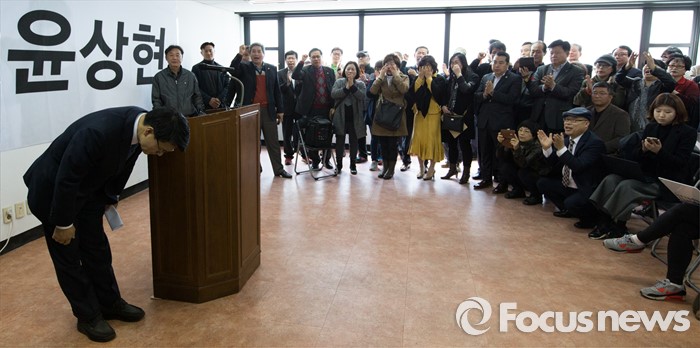 (인천=포커스뉴스) 새누리당을 탈당한 윤상현 의원이 24일 오전 인천 남구 지역구 사무실에서 무소속 출마 선언 기자회견 중 막말 파문 관련 지지자들에게 사죄하고 있다.